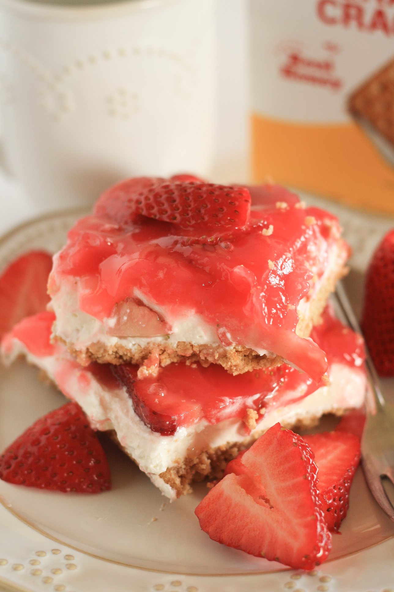 - Start by making your crust out of graham cracker crumbs. Put 14 full graham cracker sheets in plastic bag and crush them with a rolling pin. Then in a bowl mix the crumbs with 1/2 cup of melted butter and 1/4 teaspoon of salt. Then pat the crumbs down evenly in a 9×13 baking dish and bake in a 325 degree oven for 10 minutes. When the crust is done cool the pan on a wire rack. While the crust is cooling in a large mixing bowl beat the powdered sugar and (softened) cream cheese on medium speed until combined. Then fold in the (thawed) whipped topping until combined. Spread this over the cooled crust. Arrange sliced strawberries on top . Cover and chill while preparing the top layer. To make the top layer in a medium saucepan combine 1 cup granulated sugar, 1/4 cup of flour, and 3 tablespoons of strawberry-flavored gelatin. Then stir in 1 cup of water. Cook and stir until thickened and bubbly. Then cook it 1 minute more. Remove from heat . Cover and set it aside to cool for 30 minutes. Spoon the cooled gelatin sauce over the strawberry layer. Cover and chill in the refrigerator for at least 4 hours.